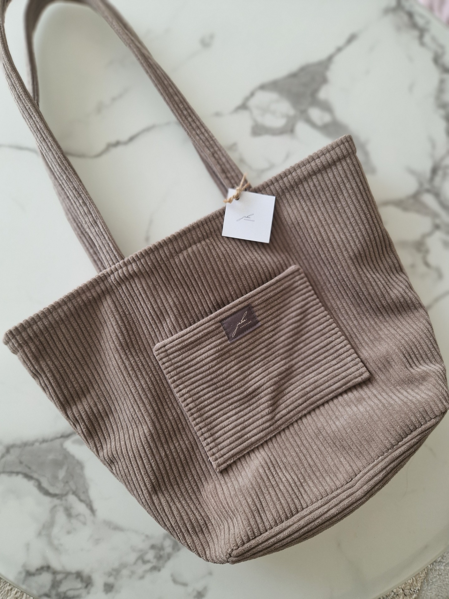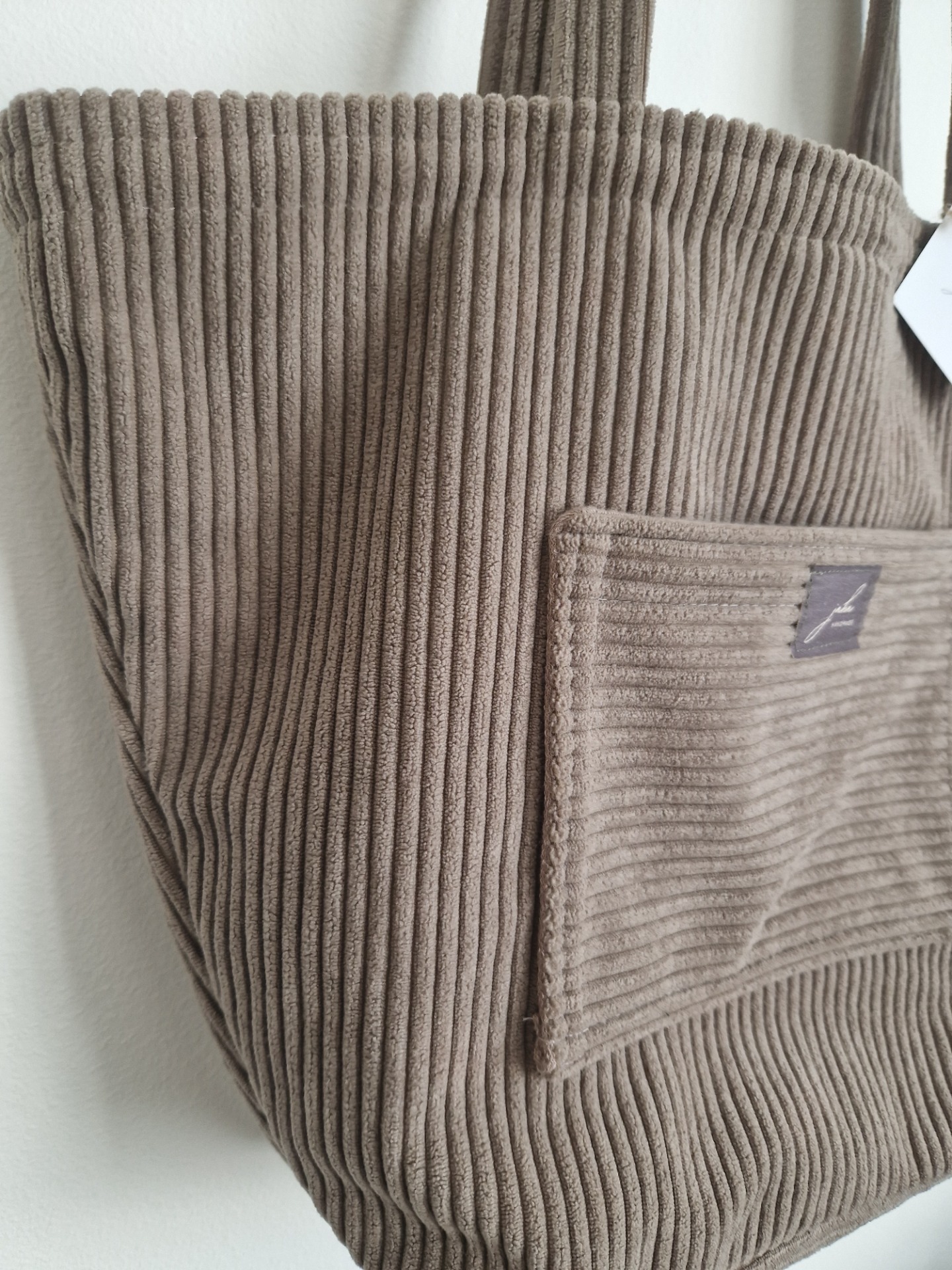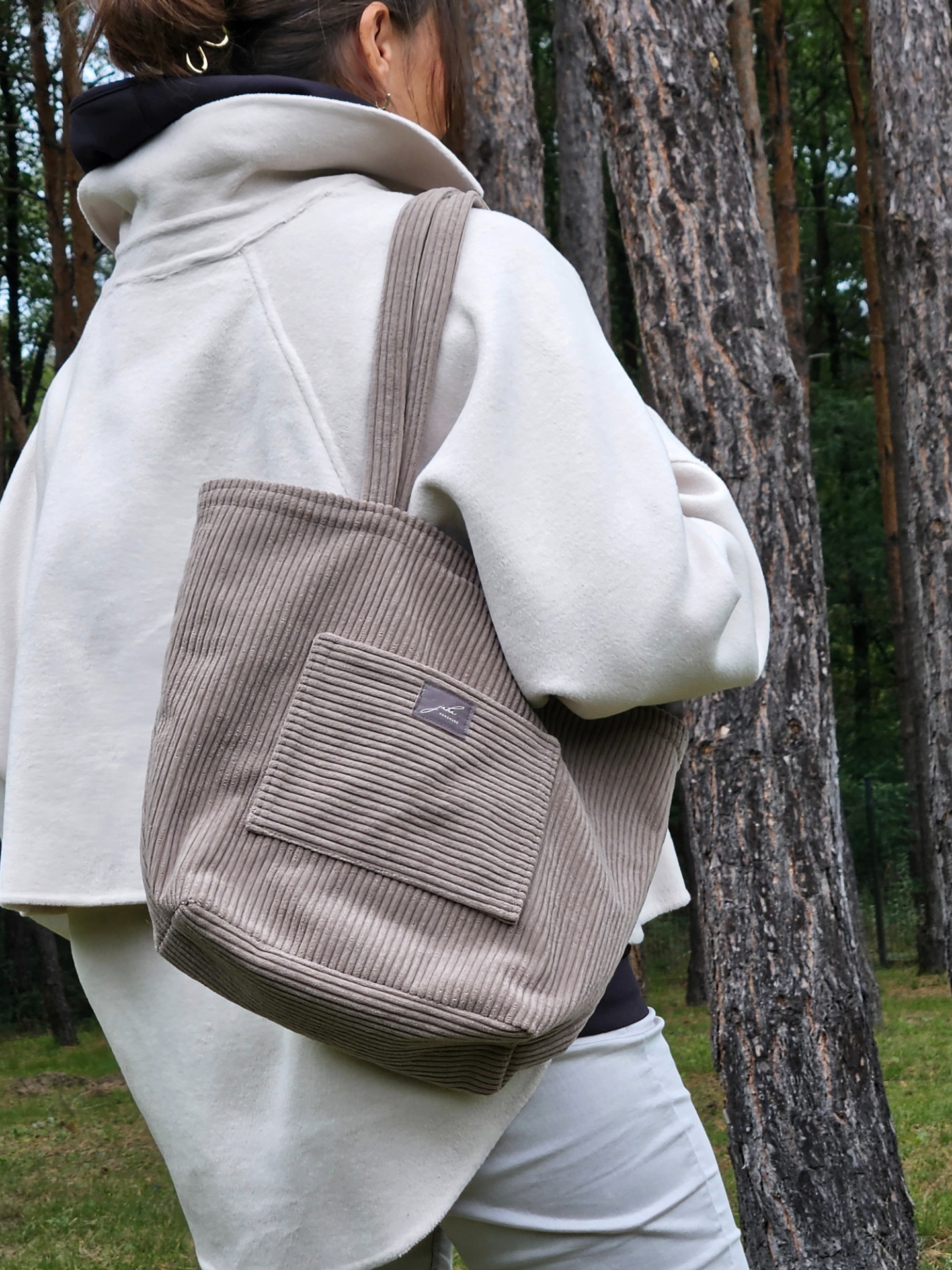 Veľká taška na rameno je ušitá z menčestrového materiálu vo farbe taupe (hnedá). Kabelka má vnútorné zapínanie na magnet.