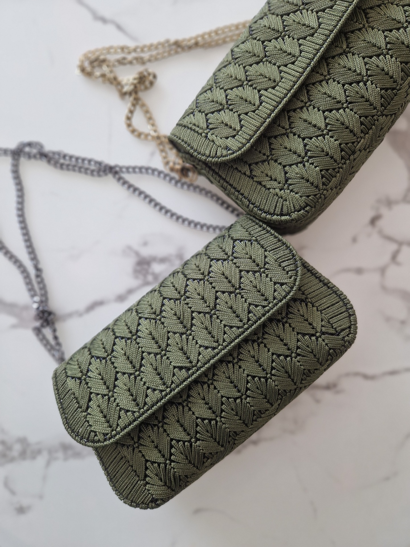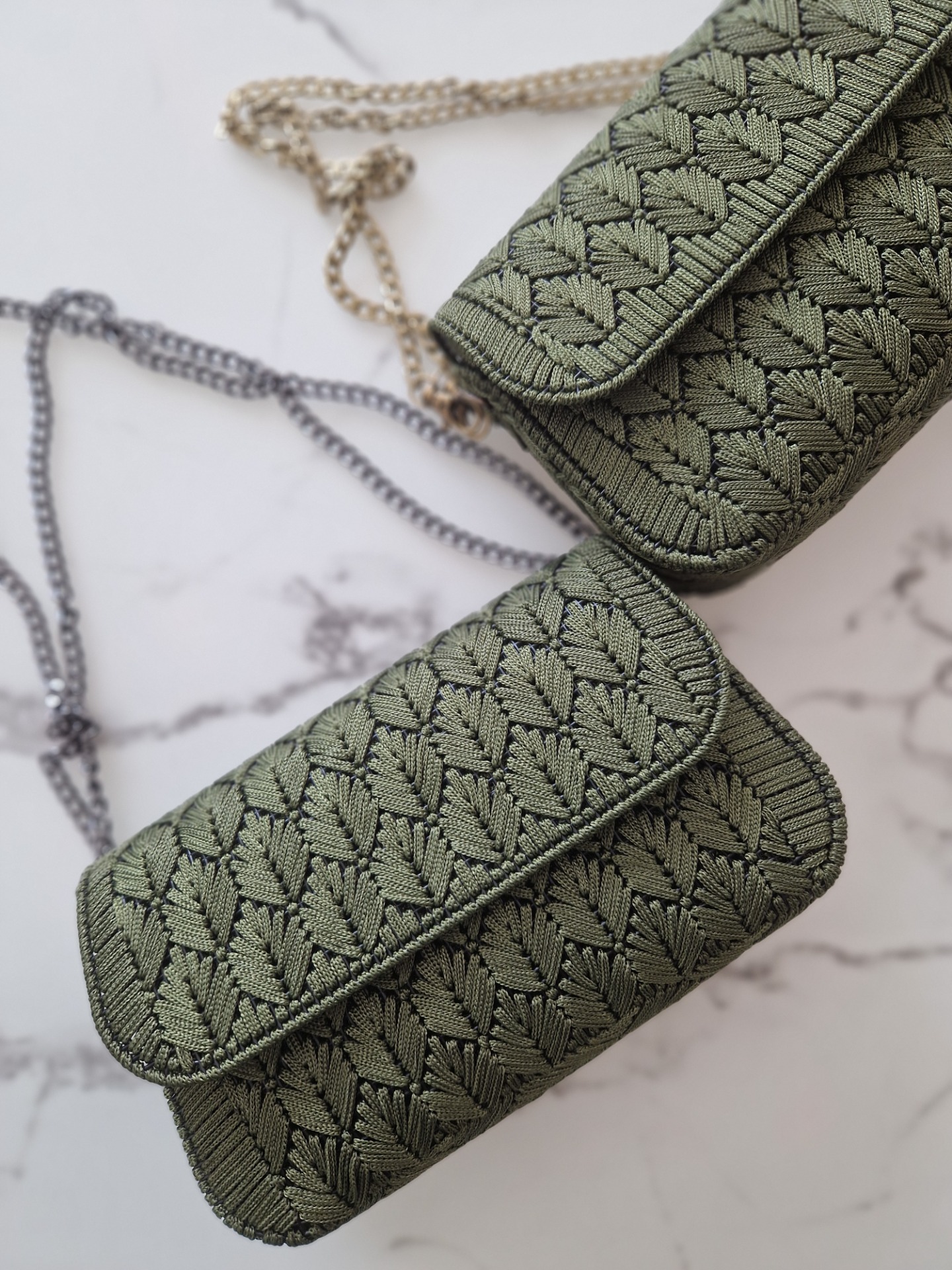 Informácie o materiáloch: Kabelka je ručne vyšívaná na plastovej kanave, vďaka čomu drží svoj tvar. Použitá je priadza z polyestru. Súčasťou kabelky je magnetické kovové zapínanie. Použité sú aj kovové prvky ako karabíny a retiazka. Kabelka je z vnútra podšitá textilnou látkou.