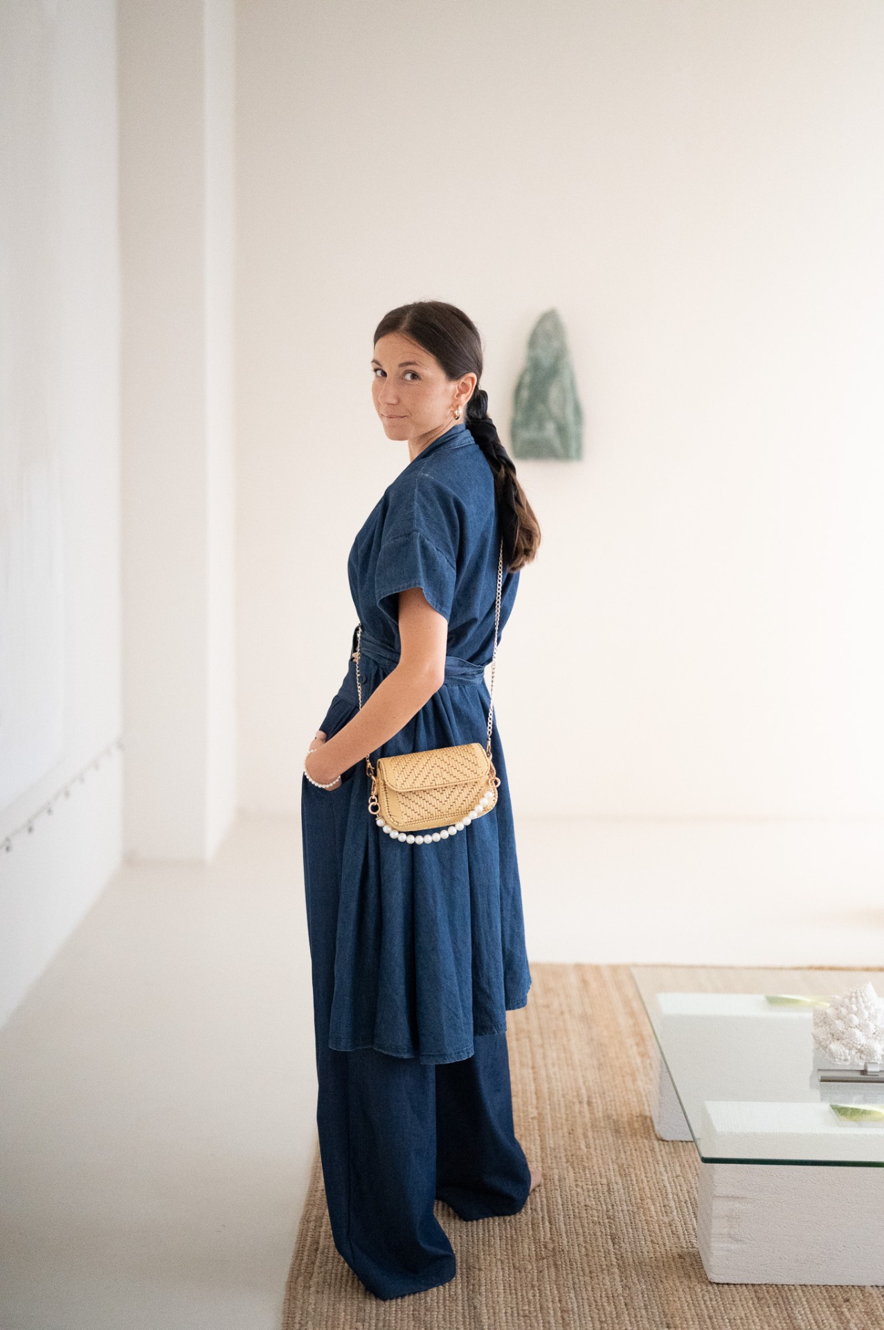 Informácie o starostlivosti a udržateľnosti výrobku: Kabelku je možné čistiť iba ľahko vlhkou jemnou handričkou (iba čistou vodou). Kabelka je vhodná iba na nosenie malých, ľahších vecí. Ideálne je nepreťažovať ju a nevystavovať ani záťaži (nepokladať na kabelku ťažké veci). V tomto prípade môže dôjsť k stlačeniu plastu, prípadnému prasknutiu alebo zmene tvaru (kabelka prestane držať svoj pôvodný tvar). Tak ako všetky materiály pracujú a menia svoju formu tak je možné, že pri častom a dlhodobom nosení môže spotrebiteľ vidieť jemne trčiace vlásky priadze, ale nie vytiahnuté. Pri neopatrnom zachádzaní je možné zatrhnutie alebo úplne vytrhnutie priadze. Kovové prvky na kabelke pri častom nosení, svojou dlhšou životnosťou alebo pri vystavení dlhšiemu kontaktu s vodou a inými prírodnými faktormi môžu meniť svoju farbu (chytajú prirodzenú patinu). Pri kontakte s drsnými predmetmi a neopatrnom zachádzaní je riziko škrabancov a olupovania farby na farebnom kove alebo korálkach.