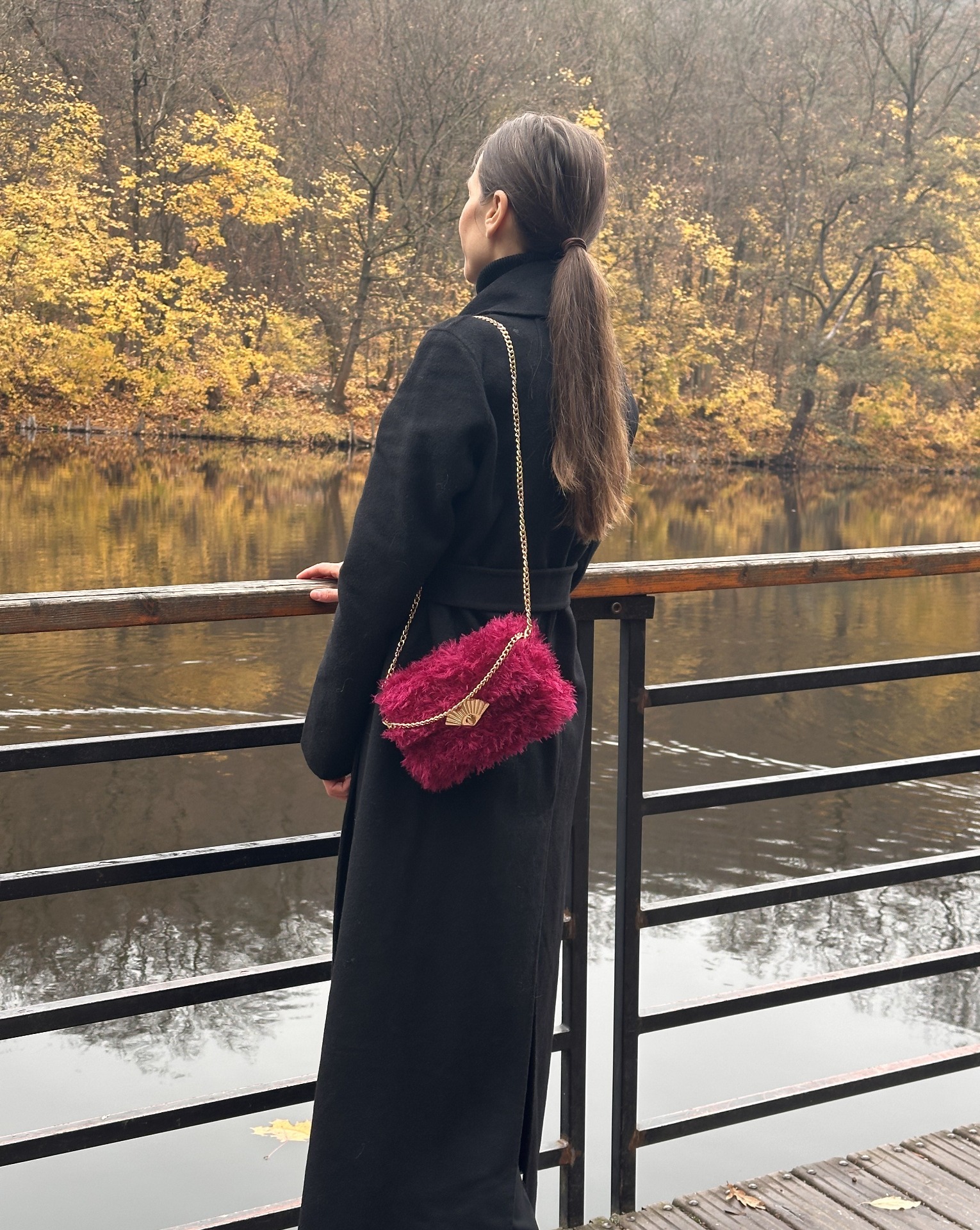 Informácie o materiáloch: Kabelka je ručne vyšívaná na plastovej kanave, vďaka čomu drží svoj tvar. Použitá je jemná plyšová priadza. Súčasťou kabelky je vonkajšie kovové zapínanie. Použité sú aj kovové prvky ako karabíny a retiazka. Kabelka je z vnútra podšitá textilnou látkou.