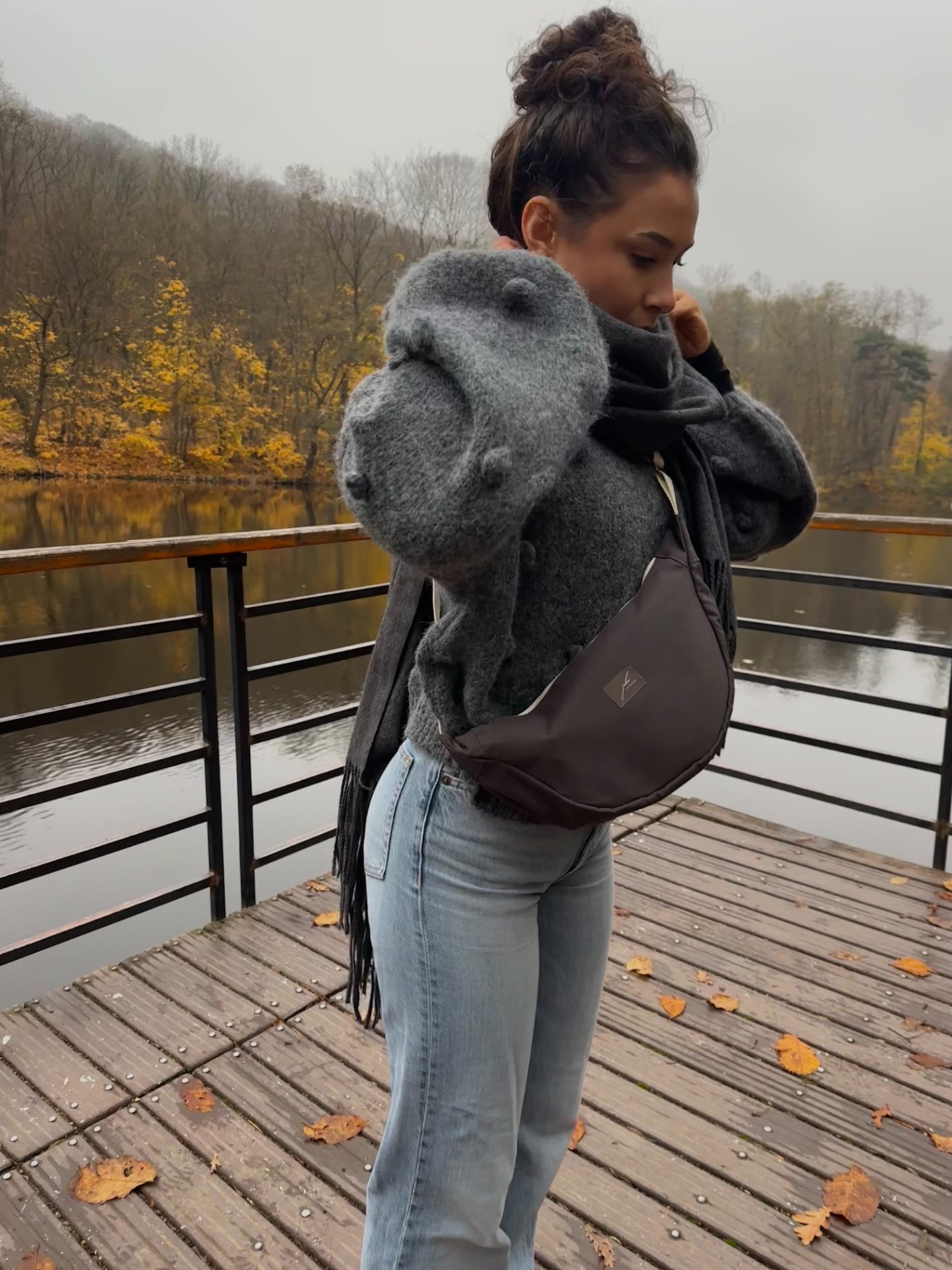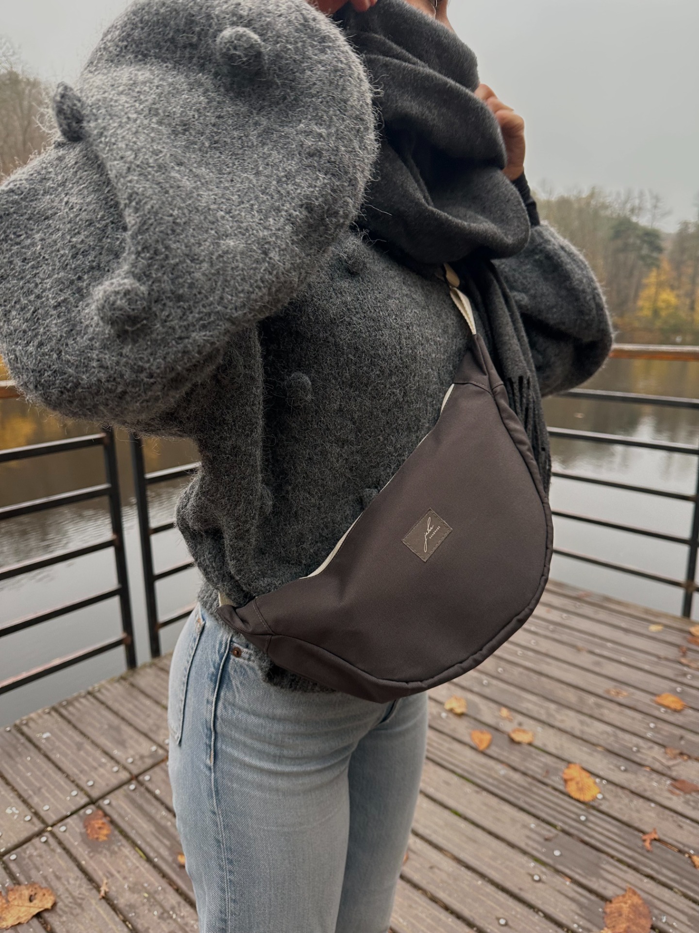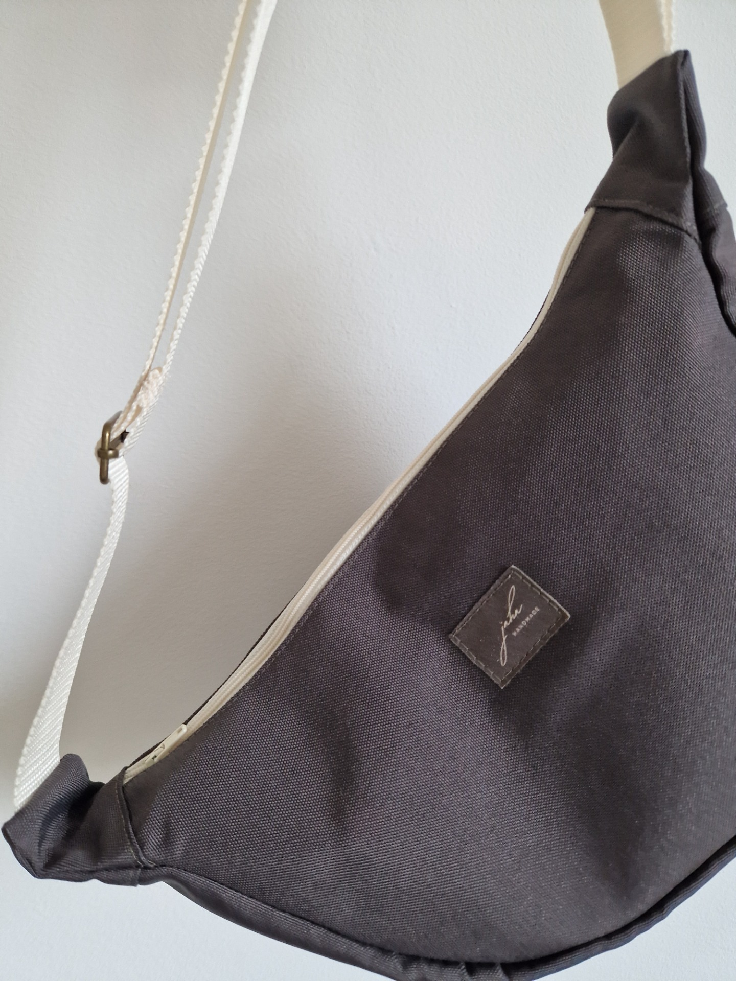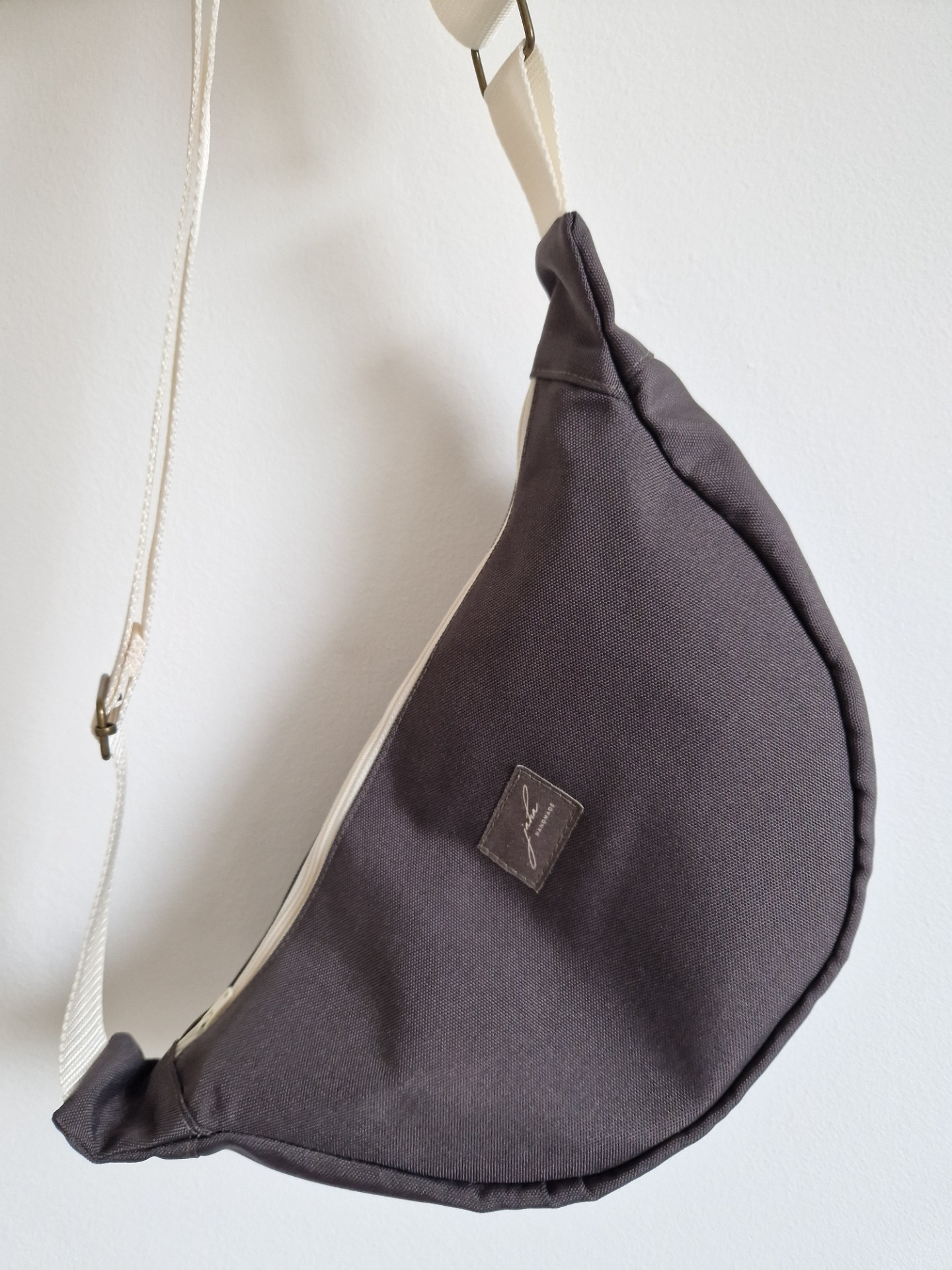 Ľahká a odolná taška z hydrofóbneho šušťákového materiálu vo farbe antracit, s bledým krémovým nastaviteľným popruhom a praktickým zapínaním na zips.