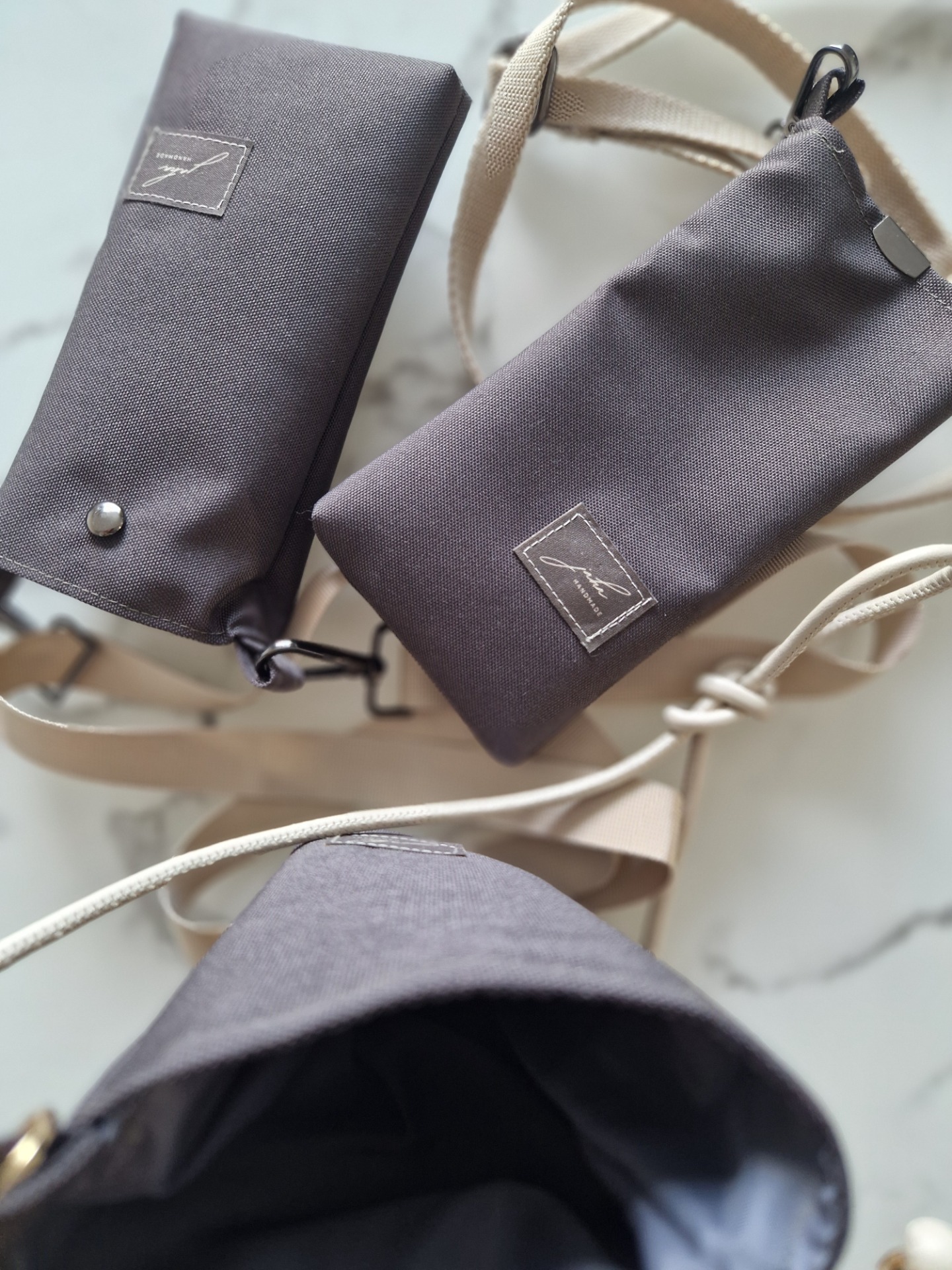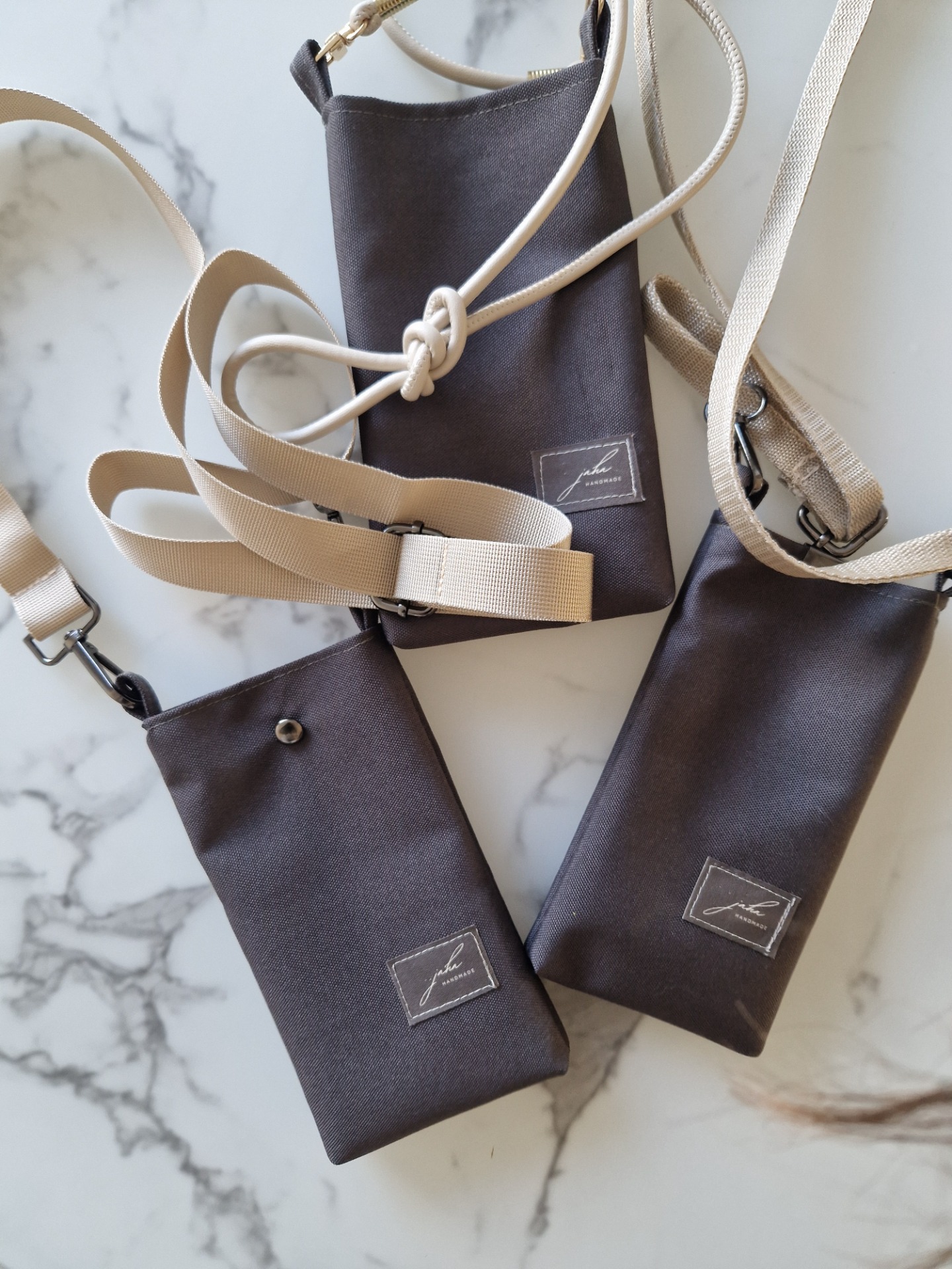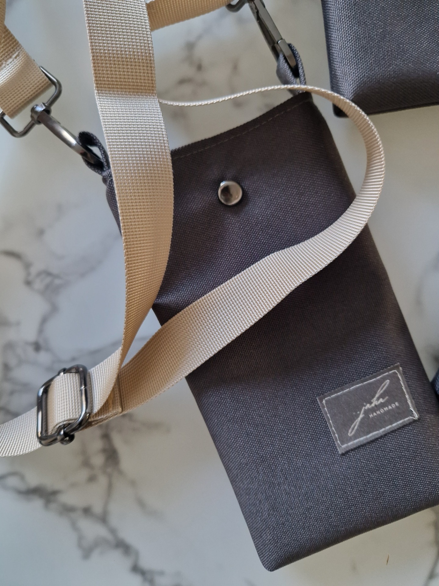 Informácie o materiáloch: Použitý je šušťákový materiál s hydrofóbnou úpravou (puzdro na mobil je odolné voči vode). Súčasťou je nastaviteľný látkový popruh a zapínanie na zips alebo magnet.